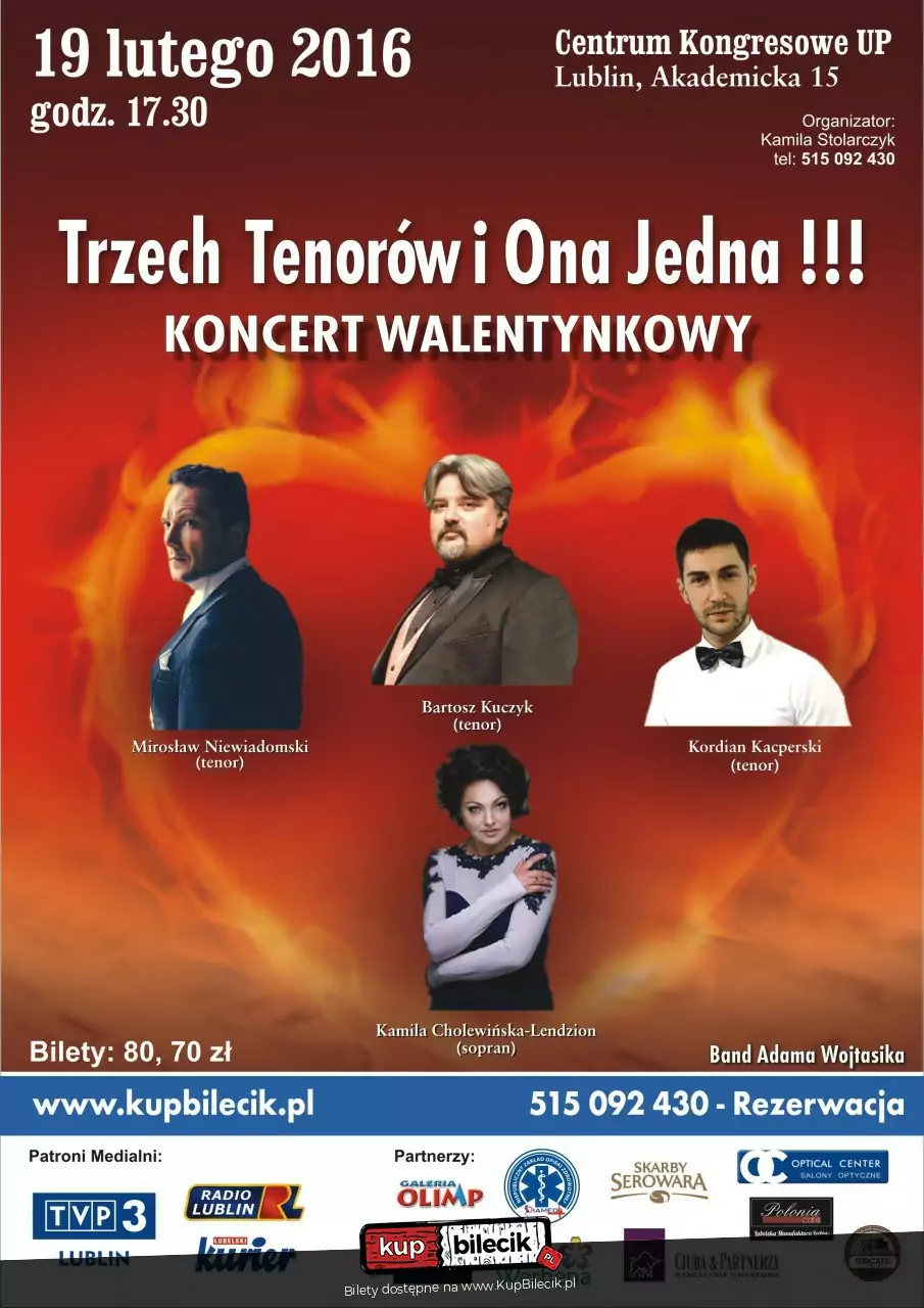 Wyjątkowe wydarzenie jakiego w Lublinie do tej pory nie było! Bowiem przed Państwem wystąpią trzej tenorzy! I nie było by w tym nic dziwnego gdyby nie fakt ,że towarzyszyć im będzie Ona,jedyna kobieta wśród trzech tenorów.Koncert Walentynkowy " Ich Trzech i Ona Jedna!!! "to zbiór takich przebojów jak "Twoim jest serce me", "Besame Mucho", "Love me tender", "Usta Milczą, dusza śpiewa" czy "Brunetki, blondynki","The Prayer" to tylko nieliczne tytuły, które ukołyszą Państwa duszę w tym wyjątkowym dniu! W powietrzu unosić się będzie słodki zapach miłości a nasi znakomici artyści sprawią, że niejedno serce cudownie zadrży w rytm największych miłosnych przebojów, zabierzemy Państwa w sentymentalną podróż po zakamarkach serca i duszy i podróż ta będzie wyjątkowo miła!!! Takie nazwiska jak Mirosław Niewiadomski (tenor), Kamila Lendzion (sopran), Kordian Kacperski (tenor), Bartosz Kuczyk (tenor) są gwarancją najwyższego poziomu artystycznego, Artyści nasi są solistami Teatru Wielkiego w Łodzi, Poznaniu, Opery Bałtyckiej, Teatru Wielkiego w Warszawie, współpracują z licznymi filharmoniami w kraju i za granicą! W programie można usłyszeć takie szlagiery jak "Granada", "Kto me usta całuje ten śni", "Podmoskiewnyje wieczory", "Song of love", "Jakże mam Ci wytłumaczyć", "Co sie dzieje oszaleję", "Tell him", "Tango Jalousie", "Halleluja", "Sway", "My way", "Walc z Nocy i Dni" czy wreszcie "Miłość Ci wszystko wybaczy"!!!Przypomnicie sobie Państwo z nami wszystkie kolory miłości a przewodnikiem w tej podróży bedzie wyśmienity Bartosz Kuczyk, który zaskoczy Państwa nie tylko pieknym śpiewem ale również błyskotliwą , pełną żaru i humoru konferansjerką !!!Przed Koncertem jak i w przerwie podajemy pyszną kawę serwowaną przez Lubelska Palarnię Kawy LUBCAFE. Dodatkową atrakcją tego Wieczoru będą degustacje oraz loteria wizytówkowa z bardzo atrakcyjnymi nagrodami.