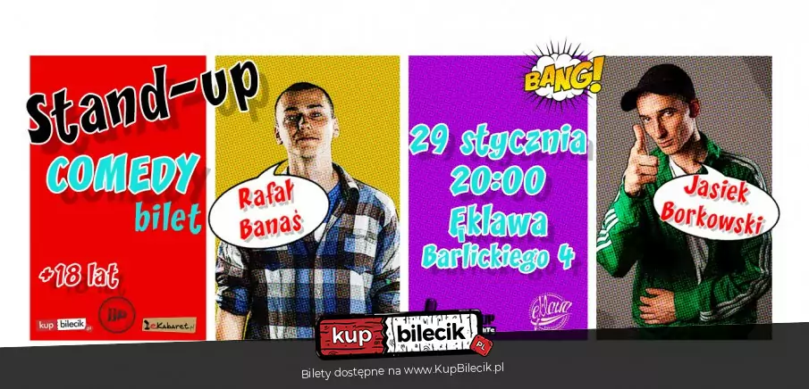 Stand-up Comedy z roku na rok staje się coraz bardziej popularny. Nie ma w nich tematów tabu ani sztuczności po prostu nie ma limitów. Wykonawcy nie potrzebują ani rekwizytów, ani bogatej scenografii do swoich występów. Wychodzą na scenę, aby rozbawić publiczność co wymaga nie lada charyzmy i pomysłowości. Ęklawa - klub kultura kawa oraz Stand-up No Limits zadbają o to, żeby dostarczyć wam solidną dawkę śmiechu. 29 stycznia w piątek wystąpią: JASIEK BORKOWSKI, związany ze Stand-Up Polska. Jak sam o sobie mówi: "Jestem jasiek....nie Antek, nie Bartek, nie Michał, nie Maciek tylko...jasiek...płynnie i fajnie..uwielbiam litere "T" dlatego cieszę sie ze mam tak na imię...jak każdy wie urodziłem się.... jakoś w 86 -podobno nazwali to jakimś wybuchem na ukrainie, a ja jestem z Polski, byłem w niej zawsze, ze wszystkich, to właśnie w niej byłem najdłużej.....często się wywracam, podnoszę się wtedy i ide znów się wywrócić..." Moglibyśmy długo rozpisywać się o jego osiągnięciach na scenie. Wymieniać fakty że występował ze stand-upem dla HBO Polska; Pisać, że cisnął podczas ROASTu takim gwiazdom jak Hubert Urbański, Szymon Majewski czy Ten Typ Mes. To wszystko i tak na nic bo Jasiek po prostu przyjdzie ubrany jak zawsze w ortalion! Niech jednak nie zbije Was to z tropu bo wystarczy 1 minuta występu, a ogarnie Was szaleńczy śmiech za sprawą błyskotliwego i jakże "głębokiego" poczucia humoru! Rafał Banaś - trener pływania i ŻYCIA, który kiedyś występował w ekipie Atomówcy. Teraz lata solo jak Han, a swoimi historiami obdarza wszystkich zainteresowanych. Poza tym świetny koleś z nieograniczoną wyobraźnią żongluje żartami i ostrymi puentami. Odwieczny wróg misia uszatka i szarej rzeczywistości. Jego historie przeniosą Was w świat niecodziennych wyzwań. Zwycięzca między innymi pierwszej "areny stand-uperów" (rywalizacji komików o najlepszy występ). Występował na jednej scenie między innymi z Abelardem Gizą, Kacprem Rucińskim, Grzegorzem Hakamą i Czarkiem Pazurą! Cena biletu: przedsprzedaż 20 zł; dzień wydarzenia 30 zł Program dla widzów dorosłych!"
