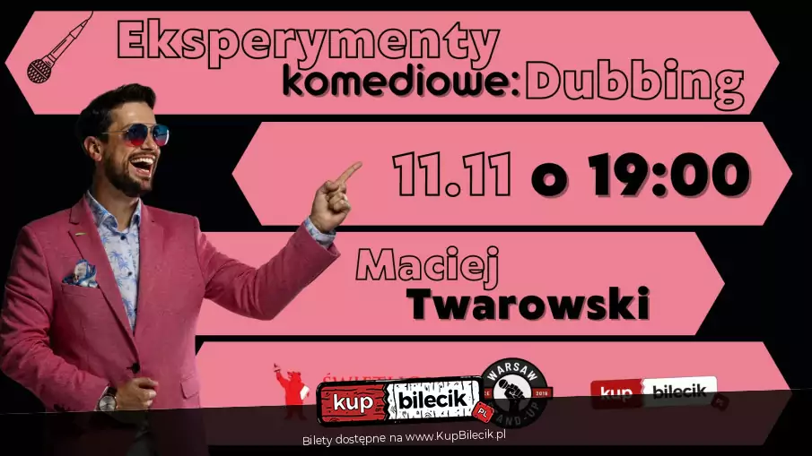 Drodzy Państwo, sympatycy komedii na żywo, zapraszamy was na unikalną imprezę komediową 11.11 o 19:00 prowadzoną przez naszego dobrego kolegę oraz nie mniej dobrego komika - Macieja Twarowskiego! Czterech(a może i więcej) śmiałków-komików zmierzy się z nowym wyzwaniem w postaci "Dubbingu", dzięki doświadczeniu i mocy improwizacji naszych komików, wszystkim znane sceny z filmów oraz filmików na YouTube, nabędą nowego znaczenia! W pierwszej części odbędzie się również open-mic.