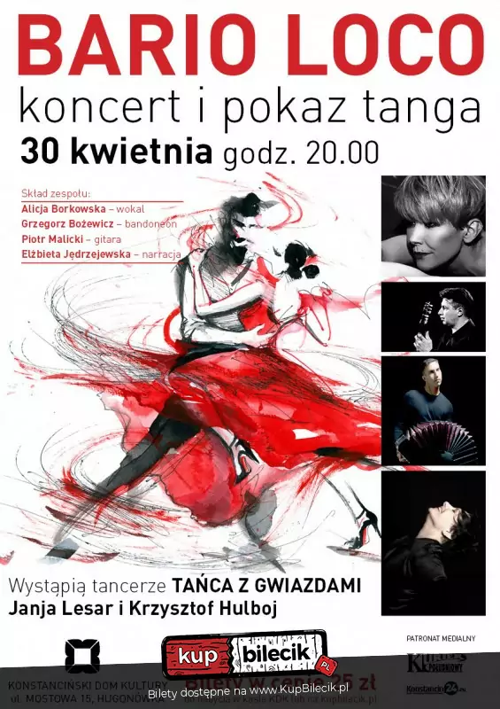 Zapraszamy na koncert zespołu Bario Loco, którego specjalnością są tanga - te prawdziwe, prosto z La Boca w Buenos Aires, grane i śpiewane z prawdziwie argentyńską pasją. Bario Loco gra zarówno tango nuevo - muzykę stworzoną przez Astora Piazzollę, jak i tango vero - piosenki Carlosa Gardela i innych bogów przedwojennych scen Argentyny. Ostatnio artyści postanowili włączyć do repertuaru również piękne, przedwojenne tanga polskich artystów - Adama Astona, Alberta Harrisa czy Hanki Ordonówny.