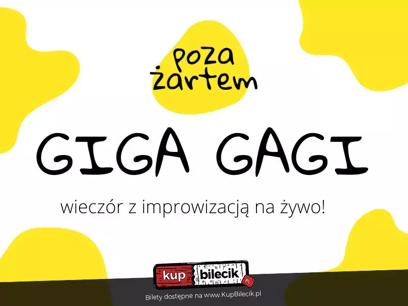 poza żartem znów improwizuje. nie będzie kilo gagów, nie będzie mega gagów - będą giga gagi, czyli nasz sztandarowy wieczór z krótkimi formami improwizowanymi! zapraszamy na wieczór z improwizacją na żywo, podczas którego zagramy dla was serię improwizowanych scen w oparciu o wasze sugestie. celne puenty, błyskotliwe żarty, wybuchy śmiechu, jednym słowem: szał. jednak nikt (nawet my!) nie wie co dokładnie się wydarzy, choć gotowi jesteśmy na wszystko. przyjdź, zobacz co potrafimy i pośmiejmy się razem!