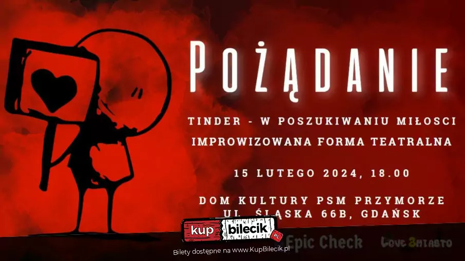 Pożądanie - W poszukiwaniu Miłości! Improwizacja/ Gra improwizacyjna/ Spektakl, w którym publiczność wpływa na przebieg scen i zachowanie aktorów. 15.02.2024 od 18:00 do 19:30 w Domu Kultury PSM Przymorze. Druga odsłona z serii Pożadania!