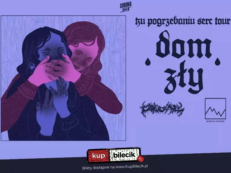 DOM ZŁY (post metal / blackened crust, Puławy / Warszawa) Dom Zły powstał w Puławach w 2016 r. Ciężko ich zaszufladkować - depresyjna i melancholijna hardcore punkowa machina romansująca z post/black metalem, okraszona screamo i crustem. W 2019 roku na miejscu wokalisty Krzyśka pojawiła się Ania, która niewątpliwie namieszała na lokalnej scenie i tchnęła w zespół nową energię. W lipcu 2021 wypuścili EPkę "Śnisz bory tak gęste", która została albumem miesiąca Metal Hammer Polska i często pojawiała się w podsumowaniach dziennikarzy i nie tylko jako album roku 2021. Po 3 latach powracają z nowym, pełnowymiarowym albumem zatytułowanym "Ku Pogrzebaniu Serc". Najnowsze wydawnictwo niewątpliwie wprowadza zespół na jeszcze wyższy muzyczny poziom i przynosi słuchaczom nowe pokłady wyzwalającego smutku oraz rozpaczy. Tym samym Dom Zły potwierdza, że należy do czołówki krajowego grania typu metal.