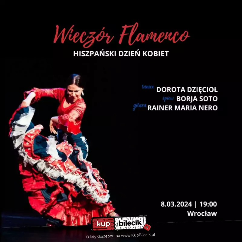 Ósmego marca zapraszamy na wyjątkowy wieczór, podczas którego przeniesiemy się na chwilę do słonecznej Hiszpanii. Na scenie pojawi się polsko-hiszpańsko-austriackie trio: zatańczy Dorota "Dolores" Dzięcioł, zaśpiewa Borja Soto, a na gitarze zagra Rainer Maria Nero. Muzycy zaprezentują m.in. canciones w stylu flamenco. Podczas wieczoru zaserwujemy 3-daniową kolację, a po koncercie DJ zaprosi Was na parkiet, aby poruszać się w rytmach hiszpańskich i latynoskich. W ten piątkowy wieczór zaproś najbliższą Ci Kobietę i spędźcie z nami wspaniały wieczór w klimatycznych wnętrzach Sali Witrażowej przy Purkyniego 1.