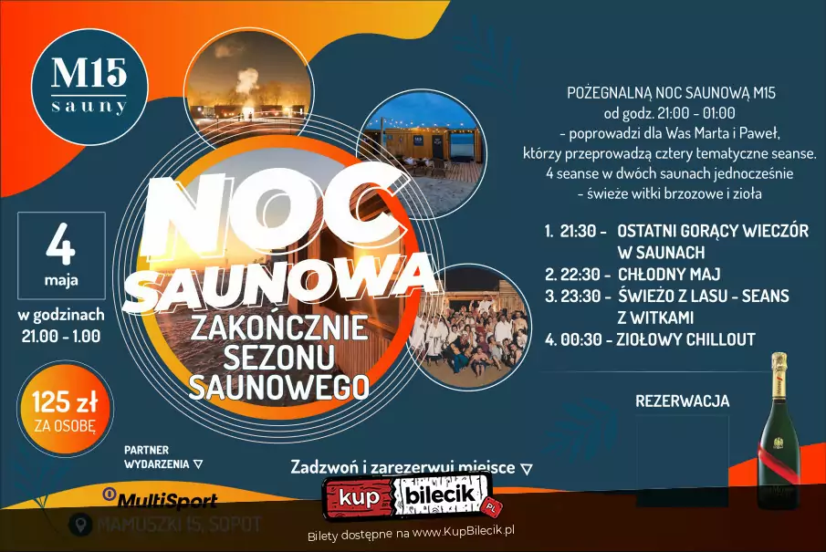 Zapraszamy na zakończenie sezonu saunowego i pożegnalną noc saunową w Saunach M15! Już 4 maja (sobota) w godz. 21:00 - 01:00 - wieczór poprowadzi dla Was Marta i Paweł, którzy przeprowadzą cztery tematyczne seanse. 4 seanse w dwóch saunach jednocześnie - świeże witki brzozowe i zioła!