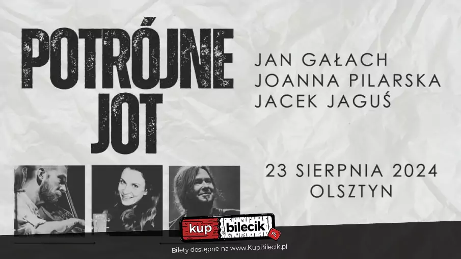 Potrójne Jot to projekt muzyczny pomysłu Jana Gałach, a do którego zaangażował również Joannę Pilarską oraz Jacka Jagusia. Wyjątkowa seria koncertów, która odbędzie się w sierpniu, da możliwość trzem niebywale utalentowanych artystom połączyć swoje siły, by stworzyć niezapomniane muzyczne doświadczenie. Jan Gałach, wybitny skrzypek, Joanna Pilarska, znakomita wokalistka, oraz Jacek Jaguś, mistrz gitary, wyruszą w unikatową trasę koncertową, która obejmie trzy polskie miasta: Magdalenkę, Ostrołękę i Olsztyn. Muzyczne wieczory spędzone w ich towarzystwie będą prawdziwą ucztą dla zmysłów. Trio zaprezentuje szeroki repertuar, idealnie wpasowujący się w atmosferę letnich, sierpniowych wieczorów. Wspólne występy Jana Gałacha, Joanny Pilarskiej i Jacka Jagusia obiecują wyjątkowe połączenie wirtuozerii skrzypiec, magii wokalu oraz niezapomnianych dźwięków gitary. Nie przegapcie okazji, aby doświadczyć na żywo magii muzyki w wykonaniu Jana Gałacha, Joanny Pilarskiej i Jacka Jagusia. Ta trasa koncertowa to nie tylko koncerty, to prawdziwe muzyczne wydarzenie, które zostanie z Wami na długo. Rezerwujcie bilety już teraz i przygotujcie się na niezapomniane sierpniowe wieczory z najlepszą muzyką!