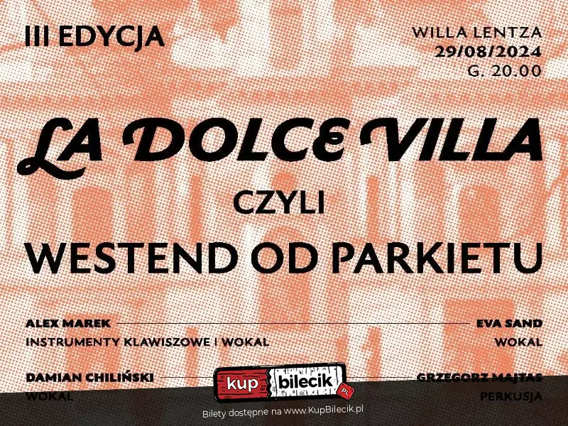W czwartek, 29 sierpnia (od godziny 20.00), zapraszamy na wyśmienitą zabawę w ogrodzie Willi Lentza przy rytmach polskich i światowych przebojów. Utwory m.in. Krzysztofa Krawczyka, Zbigniewa Wodeckiego, Tiny Turner, ABBY itp. wykonają Alex Marek - instrumenty klawiszowe i wokal, Eva Sand - wokal, Damian Chiliński - wokal, Adrian Kluś - bas, Grzegorz Majtas - perkusja. Program został przygotowany przez Alexa Marka. Początek koncertu o godzinie 20:00.
