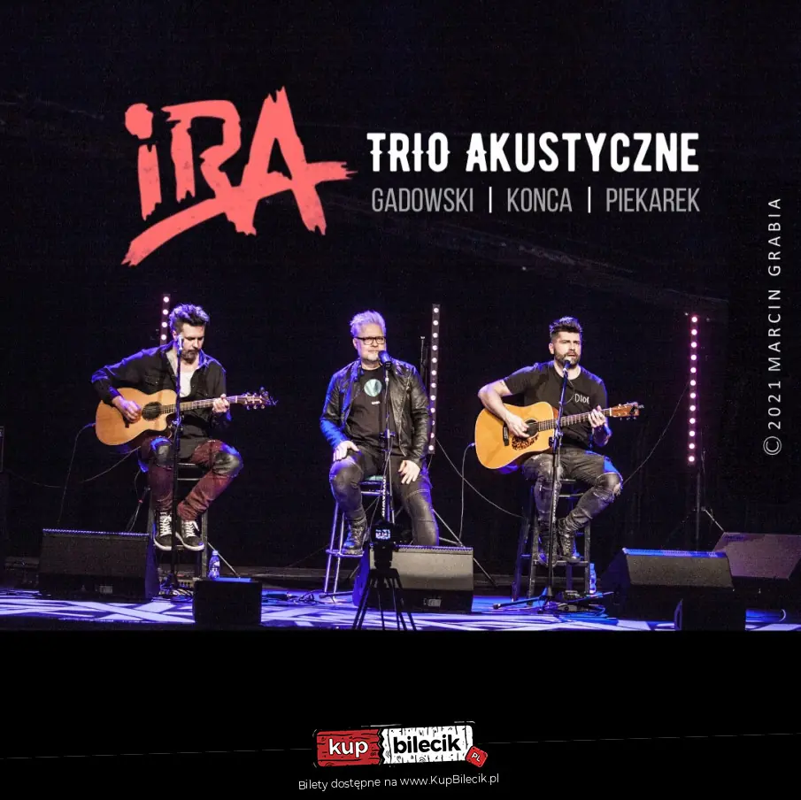 IRA - Trio Akustycznie czyli Artur Gadowski, Sebastian Piekarek i Piotr Konca! Każdy, kto choć raz był na koncercie IRA, wie, jak magiczną i gorącą atmosferę mają ich występy. Tym razem podczas koncertu zobaczymy delikatniejsze i bardziej liryczne oblicze. IRA to jeden z najbardziej rozpoznawalnych rockowych składów na polskim rynku. Na ich piosenkach wychowały się całe pokolenia. Przeboje "Nadzieja ", "Mój dom" lub "Wybacz" nadal tkwią w pamięci słuchaczy. Energia sceniczna pomogła uzyskać grupie miano jednej z najlepiej prezentujących się na żywo formacji naszego kraju! Trio w składzie Gadowski, Piekarek, Konca to kameralna twarz zespołu. Podczas koncertu usłyszymy największe przeboje zespołu w akustycznych, gitarowych aranżacjach idealnie pasujących na kameralne i intymne koncerty!