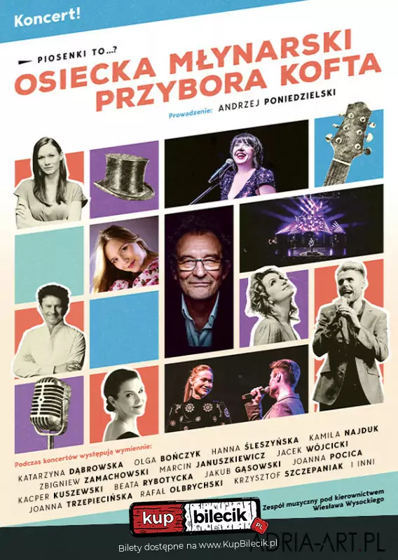 - Ten koncert jest artystycznym spotkaniem moich duchowych nauczycieli z moimi uczniami - mówił odpowiedzialny za cały projekt Andrzej Strzelecki. Po śmierci artysty w roli konferansjera zastąpił go Andrzej Poniedzielski. "Piosenki to...? - koncert Osiecka, Młynarski, Przybora, Kofta" to wydarzenie, które zapadnie Państwu w pamięć jako wspaniała, nostalgiczna podróż wśród dzieł wirtuozów polskiej piosenki.