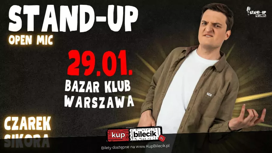 Stand-up Open Mic z prowadzącym Czarkiem Sikorą. Wieczór pełen śmiechu i dobrej energii! Jeśli lubisz humor na żywo i chcesz zobaczyć, jak komicy testują nowe żarty, to wydarzenie jest dla Ciebie. Wystąpią zarówno początkujący, jak i bardziej doświadczeni stand-uperzy, a całość poprowadzi niezastąpiony Czarek Sikora.