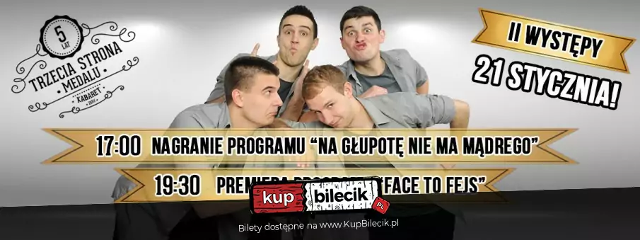 Kabaret Trzecia Strona Medalu powraca na rodzime tereny! Dwa występy, dwa programy! Sobota 21 stycznia godz. 17:00 oraz godz. 19:30! "Uczestnicy ponad 50 Festiwali Kabaretowych, laureaci 46 nagród i wyróżnień. Mieszkańcy głębokiego Podkarpacia, ludzie Dalekiego Wschodu. Inteligentni, przystojni, zabawni - tylko tego im brakuje. Ostatni kabaret rodem z Przemyśla tworzył około 100 lat temu. Czterech facetów i jedna gitara. Bawią, uczą, a gitarzysta dobrze śpiewa. Kabaret Trzecia Strona Medalu powstał w 2011 roku na uczelni PWSW w Przemyślu a od 2013 roku związany z krakowską sceną kabaretową. Prezentują nietypowy humor z dawno zapomnianych kabaretowo terenów Przemyśla i okolic. To właśnie w Przemyślu stawiali swoje pierwsze kroki, nim wyruszyli w daleką podróż, by zarażać podkarpackim humorem i entuzjazmem innych ludzi. Na godzinę 19:30 zapraszamy na premierę programu pt. "Face to fejs". Przemyska premiera, powstałej jesienią, najświeższej produkcji Kabaretu Trzecia Strona Medalu! Program, który na chwilę oderwie Cię od cyberprzestrzeni, rozbawi, zaskoczy a nawet skłoni do refleksji. Z naciskiem na rozbawi.. i zaskoczy!