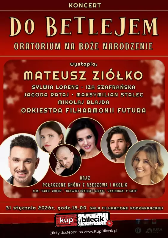 Magiczna, muzyczna podróż "Do Betlejem" z udziałem gwiazd! Mateusz Ziółko, Izabela Szafrańska, Sylwia Lorens, Jagoda Rataj, Maksymilian Stalec oraz połączone chóry dziecięco-młodzieżowe* i orkiestra Filharmonii Futura pod dyrekcją kompozytora - Mikołaja Blajdy zapraszają na jedyny w sezonie 2025/26 ekskluzywny koncert w Filharmonii Podkarpackiej. Oratorium na Boże Narodzenie "Do Betlejem" to współczesne kolędy i pastorałki, napisane do przepięknych tekstów XX wiecznych, polskich poetów. Koncert o familijnym charakterze wprowadza widza w wyjątkowy, bożonarodzeniowy świat. Pełne pozytywnego przekazu świąteczne historie, opowiadane są przez solistów i chóry, którym towarzyszy orkiestra krakowskiej Filharmonii Futura (w sumie ponad 250 wykonawców!). "Do Betlejem" to niepowtarzalne widowisko z udziałem najlepszych głosów polskiej sceny! Czas trwania: 1,5 godz. Organizator: Filharmonia Futura.