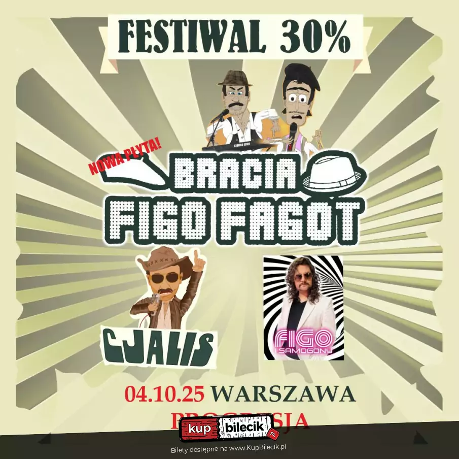 Już tej jesieni skłócona ferajna w składzie Bracia Figo Fagot, Cjalis oraz Figo i Samogony ruszą przez Polskę długą i szeroką, aby bawić się na całego! Na 30 procent. To już trzecia - jubileuszowa - odsłona Festiwalu dlatego jesienią nie zabraknie dodatkowych atrakcji. W planach światła, lasery oraz NOWOŚĆ - muzyka. Dokładnie! Figo