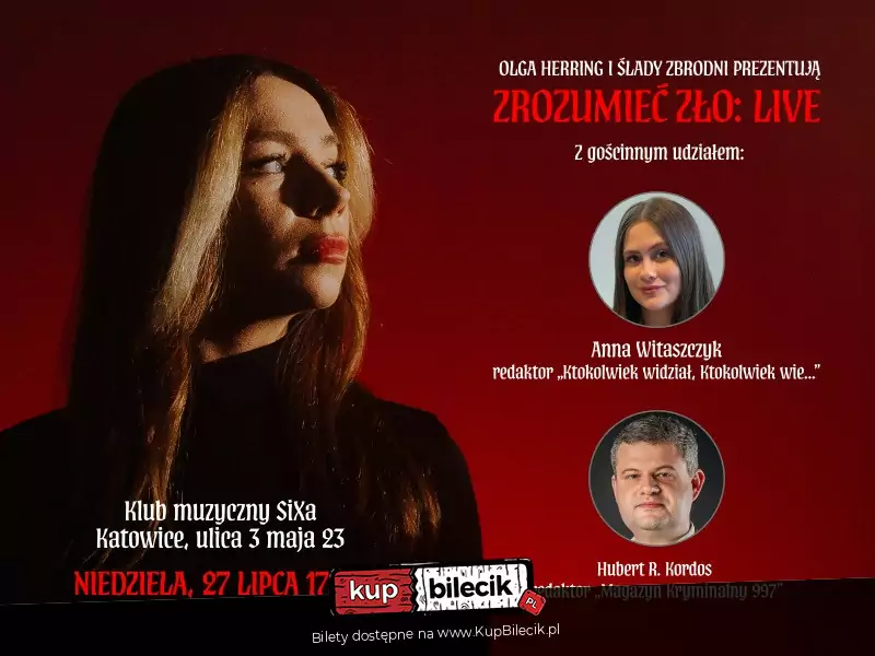 "Zrozumieć Zło: Live" to nowa seria autorskich spotkań organizowanych przez Olgę Herring i zespół Śladów Zbrodni, na których będziecie mieć szansę poznać na żywo jedną z najbardziej znanych dziennikarek zajmujących się true-crime oraz porozmawiać z nią i jej gośćmi, ludźmi których praca związana jest z poszukiwaniem i ujawnianiem realnych śladów zbrodni.