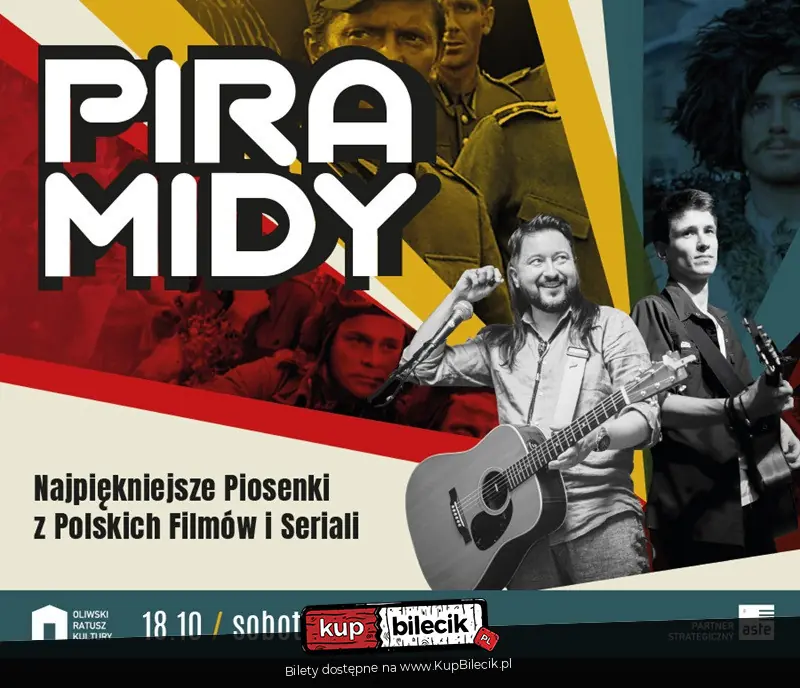 W tym koncercie zabrzmią świetne aranżacje kultowych piosenek z dawnych lat! Usłyszycie najpiękniejsze ballady filmowe jak np.: Nim wstanie dzień (śpiewana niegdyś przez Edmunda Fettinga w filmie Prawo i pięść), legendarny walc z Nocy i dni, piosenki z seriali: Czarne chmury, Czterej pancerni i pies, Jan Serce, Stawka większa niż życie, Kariera Nikodema Dyzmy, a nawet piosenki z sienkiewiczowskiej trylogii w reż. Jerzego Hoffmana - z filmów Potop czy Pan Wołodyjowski. Nie zabraknie pieśni wesołych, które zaśpiewamy wspólnie oraz poważnych - choćby jak ta z legendarnej Lawy w reż. Tadeusza Konwickiego. Będzie dużo humoru, opowieści o znanych aktorach i anegdot, które przeniosą Państwa w świat polskiego filmu. To wszystko stworzy niepowtarzalny klimat - zespół Piramidy znany jest także z niebanalnego kontaktu i śmiesznych dialogów z publicznością. Będzie to wieczór pełen emocji, dobrego humoru i dobrej muzyki w perfekcyjnym wykonaniu wspaniałych artystów.