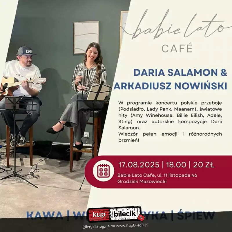 Zapraszamy na drugi koncert duetu Darii Salamon i Arkadiusza Nowińskiego w kawiarni Babie Lato w Grodzisku Mazowieckim. Koncert będzie podzielony na dwie części - klasyki światowej muzyki pop i rock oraz klasyki polskiego rocka w wersji akustycznej. Usłyszycie muzykę takich wykonawców jak Sting, Amy Winehouse, Nina Simone, Lady Pank, Dżem i wiele innych. Będą też utwory autorskie. Zapraszamy na koncert przy dobrej kawie, ciastku i winie.