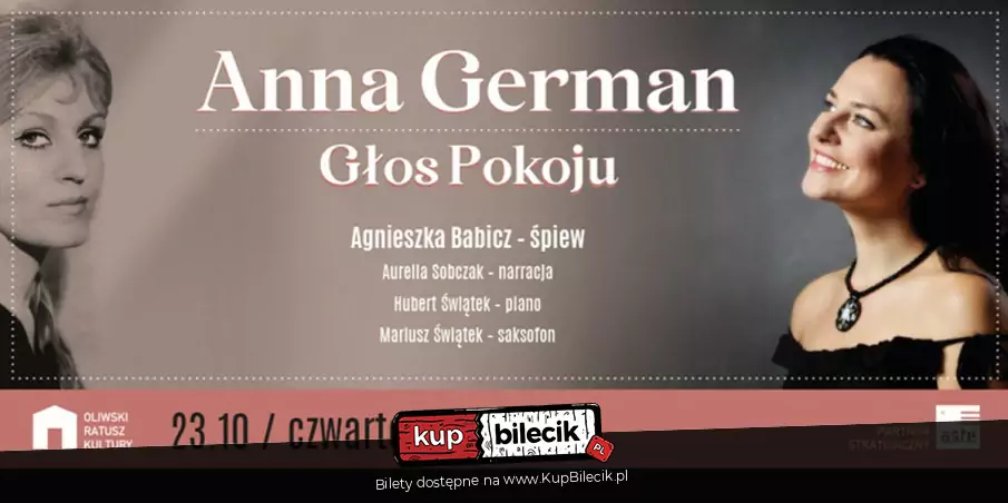 Oliwski Ratusz Kultury zaprasza na wyjątkowy wieczór muzyczny poświęcony Annie German - artystce o niezwykłym głosie i jeszcze piękniejszym sercu. W koncercie "Anna German - Głos Pokoju" w wykonaniu Agnieszki Babicz przeniesiemy się w świat jej niezapomnianych piosenek - niosących nadzieję, miłość i otuchę w czasach niepokoju.