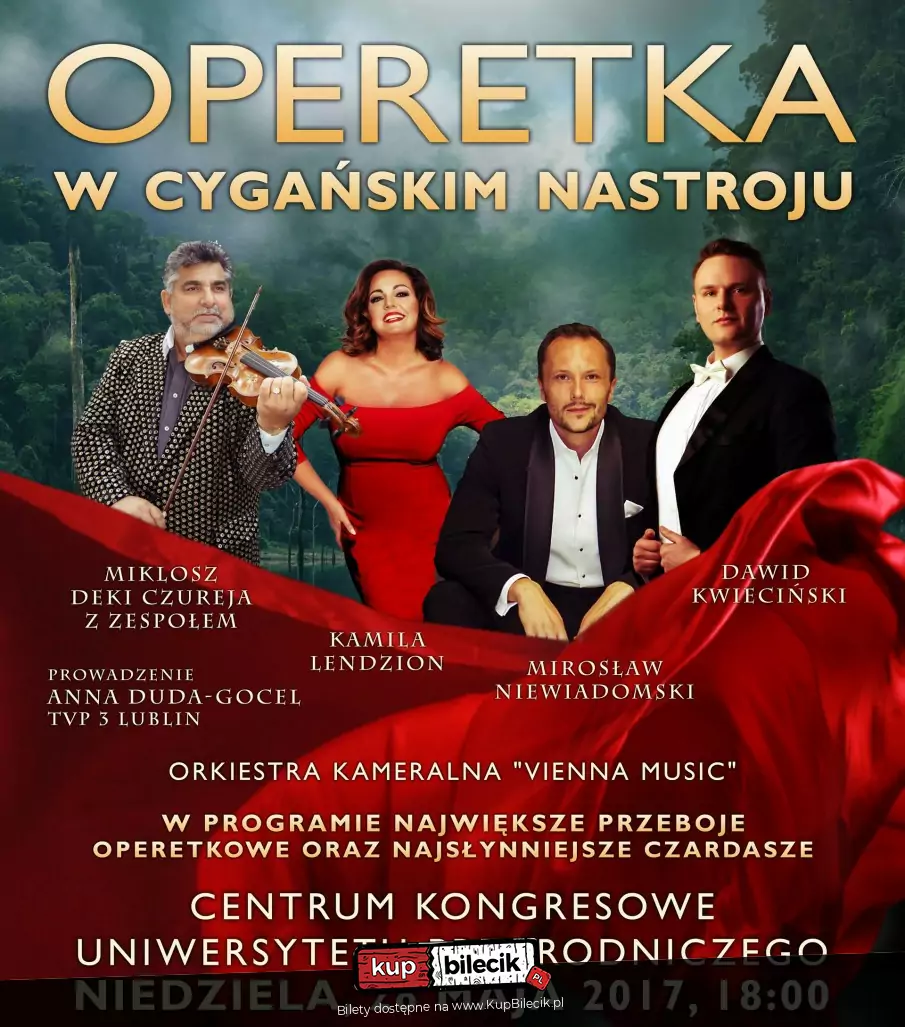 Usłyszycie również Państwo znane i lubiane duety w a oczy cieszyć będzie feerią barw Cygańskiego Taboru. Koncert poprowadzi dla Państwa pełna profesjonalizmu, elegancji i elokwencji Anna Duda Gocel!
