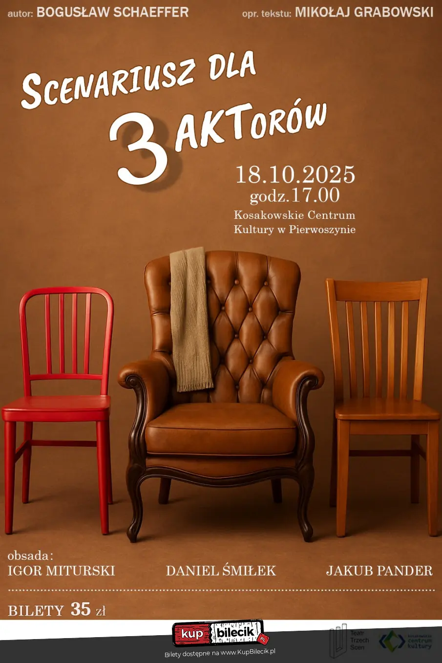 Czy można napisać scenariusz, który nigdy się nie kończy, a każdy występ jest jedyny w swoim rodzaju? Witaj w świecie Bogusława Schaeffera i jego "Scenariusza dla trzech aktorów" - spektaklu, który bawi, zaskakuje i przekracza granice teatralnej konwencji. Trzech aktorów, jedna scena i pełna improwizacji partytura, w której granice między postacią, aktorem i widzem nieustannie się zacierają. To wybitne widowisko wystawione przez TEATR TRZECH SCEN możecie obejrzeć w Kosakowskim Centrum Kultury 18 października 2025 r o godzinie 17.00.