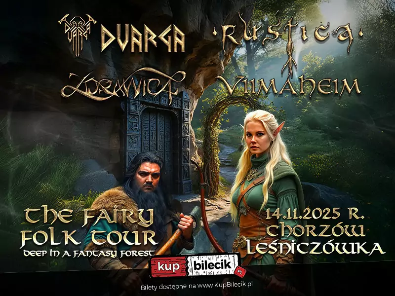 Po raz pierwszy w historii krasnoludzkie i elfickie plemiona łączą się w magii muzyki z fantastycznych światów i wyruszają w legendarną trasę! Zderzenie stalowych riffów i krystalicznie czystych harmonii! Powiew leśnych ścieżek spotyka się z surowością i potęgą skał. Jedyna okazja, by usłyszeć muzyczne spotkanie, o którym będą pisać fantastyczne kroniki przez stulecia! FANTASTYCZNA BIESIADA TO TAKŻE MAGICZNE ŚWIĘTOWANIE URODZIN Aleksandra "ALURA" Majorczyka. W ramach jesiennej trasy The Fairy Folk Tour 2025 w Chorzowie w Leśniczówce wystąpią dla Was niezwykłe składy: