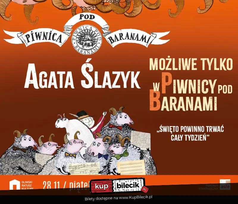 Oliwski Ratusz Kultury zaprasza na recital Agaty Ślazyk w koncercie piosenek satyrycznych i nie tylko... zatytułowanym MOŻLIWE TYLKO W PIWNICY POD BARANAMI: "Święto powinno trwać cały tydzień."