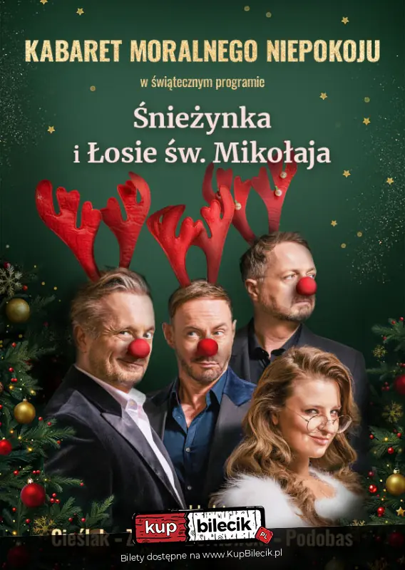 Świąteczna odsłona Kabaretu Moralnego Niepokoju wraca w zupełnie nowym wydaniu! "Śnieżynka i Łosie św. Mikołaja" to wieczór pełen ciepłego, grudniowego klimatu - tam, gdzie zapach piernika spotyka się z salwami śmiechu, a kultowe numery zyskują wyjątkową, świąteczną oprawę.