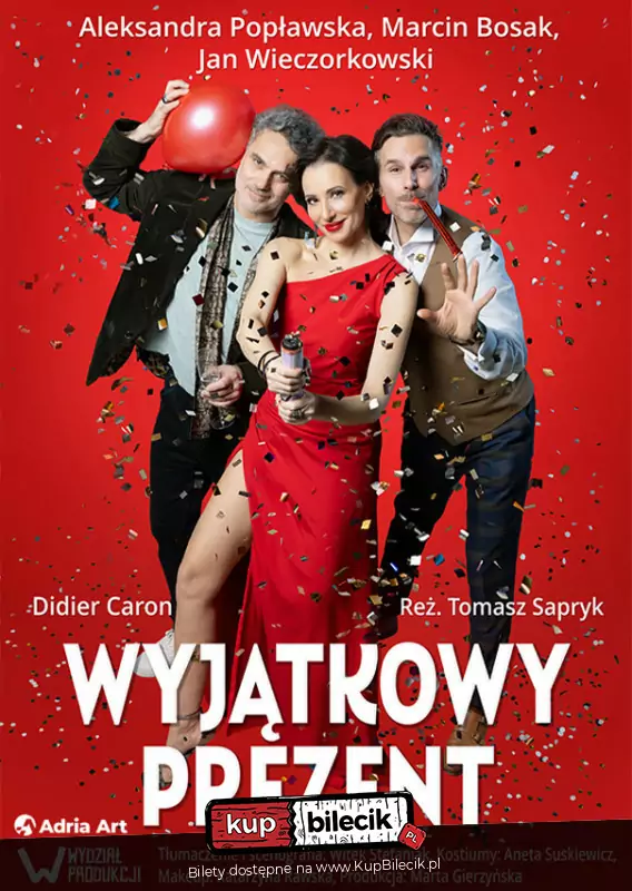 Co podarować człowiekowi, który zdaje się mieć już wszystko i z którym łączy nas ponad trzydzieści lat przyjaźni? Nieśmiertelne skarpetki, krawat czy może coś bardziej wyszukanego? Decyzja nie jest łatwa, a jeden odważny i drogi prezent może zrujnować nie tylko urodzinową imprezę, ale także może wpłynąć na dalszą przyjaźń i relacje rodzinne. Ciekawe, co to może być... Eric kończy 50 lat, a jego żona Sabine postanowiła uczcić tę wyjątkową rocznicę kameralną kolacją w towarzystwie najlepszego przyjaciela i wspólnika - Gilles'a. Kolacja zapowiada się obiecująco, jednakże ekstrawagancki podarunek wystawi ich relację na próbę. Ten wieczór okaże się mniej spokojny, niż pierwotnie planowano. Przygotujcie się na śmiech, emocje i zaskakujące zwroty akcji, bo komedia teatralna "Wyjątkowy prezent" zaskakuje każdego. Znakomita gra aktorska sprawi, że wczujesz się w historię bardziej niż kiedykolwiek! Gotowi?