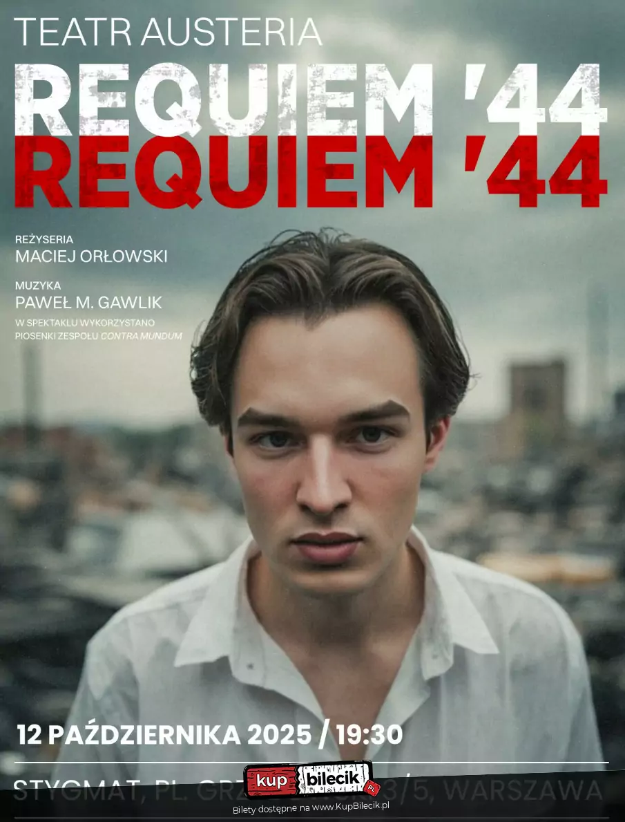 Zapraszamy na wyjątkowy spektakl w reżyserii Macieja Orłowskiego, o cywilach Powstania, ich walce o przetrwanie, szaleństwie i nadziei, która jest silniejsza od śmierci. Wzruszająca muzyka Pawła M. Gawlika i pieśni zespołu Contra Mundum do słów poetów Powstania Warszawskiego: Tadeusza Gajcego, Krzysztofa Kamila Baczyńskiego i Józefa "Ziutka" Szczepańskiego i innych "Kolumbów Rocznik 20", dopełniają tę wyjątkową impresję. "Requiem '44" to nie tylko spektakl, to akt pamięci. Przyjdźcie, usiądźcie i posłuchajcie opowieści, która tak długo czekała na to, by ją wypowiedzieć.