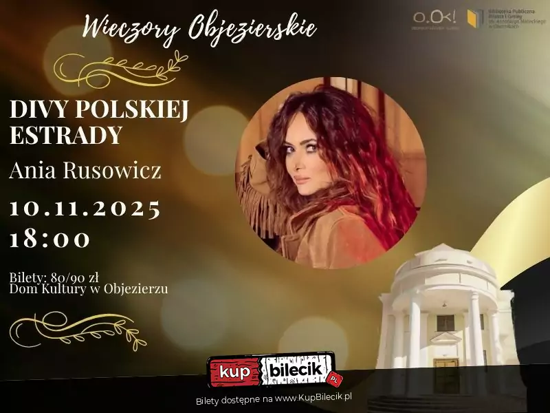 W ramach cyklu "Wieczory Objezierskie" zapraszamy na niezwykły koncert Anny Rusowicz, która zabierze nas w muzyczną podróż śladami największych div polskiej estrady. Usłyszymy ponadczasowe przeboje, które na trwałe wpisały się w historię polskiej muzyki rozrywkowej - w nowych, wyjątkowych interpretacjach.