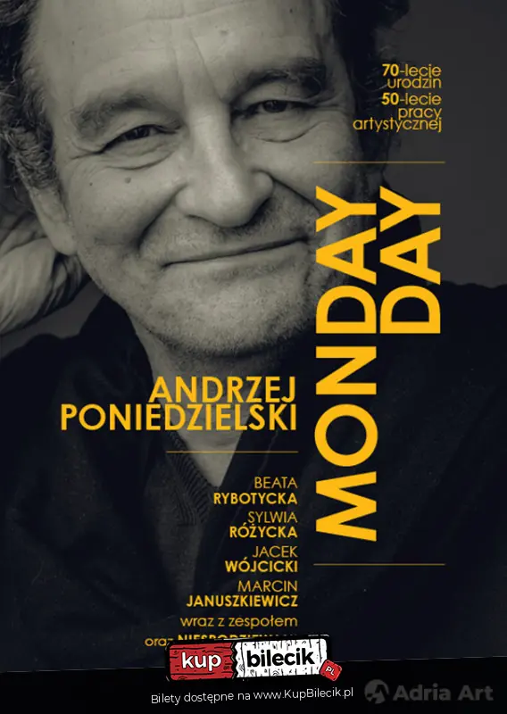 Zapraszamy na niezwykły koncert z okazji 50-lecia pracy artystycznej Andrzeja Poniedzielskiego, zatytułowany "Monday-Day". Wraz z zaproszonymi gośćmi artysta zaprezentuje swoje największe przeboje. Andrzej Poniedzielski, legenda polskiego kabaretu, świętuje 50 lat kariery artystycznej. To nie tylko wybitny satyryk i poeta, ale także autor inteligentnych tekstów piosenek, które od lat bawią i wzruszają publiczność. Podczas koncertu "Monday-Day" będziemy mieli okazję usłyszeć przekrój artystycznej drogi Andrzeja Poniedzielskiego. Do wspólnego świętowania artysta zaprosił wspaniałych wykonawców, takich jak Beata Rybotycka, Sylwia Różycka, Marcin Januszkiewicz i Jacek Wójcicki. Nie zabraknie również niespodziewanych gości. Całość będzie otoczona niepowtarzalną oprawą muzyczną, która zagwarantuje niezapomniane wrażenia, pełne emocji i wzruszeń. Dołącz do nas, aby uczcić pięćdziesiąt lat niezwykłej kariery Andrzeja Poniedzielskiego podczas koncertów "Monday-Day". Sprawdź repertuar i zarezerwuj bilety online.