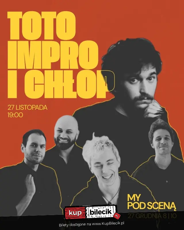 Zapraszamy serdecznie na muzyczny spektakl, w którym widzowie zdecydują o wszystkim co wydarzy się na scenie! Improwizowane spektakle grupy TOTO IMPRO to połączenie komedii, stand upu oraz koncertu! A wszystko zostaje stworzone na oczach publiczności! Każda improwizowana piosenka, scena, relacja i historia tworzone są do Waszych sugestii! Rozśmieszać będą Was zawodowi aktorzy-wokaliści w akompaniamencie żywej muzyki!