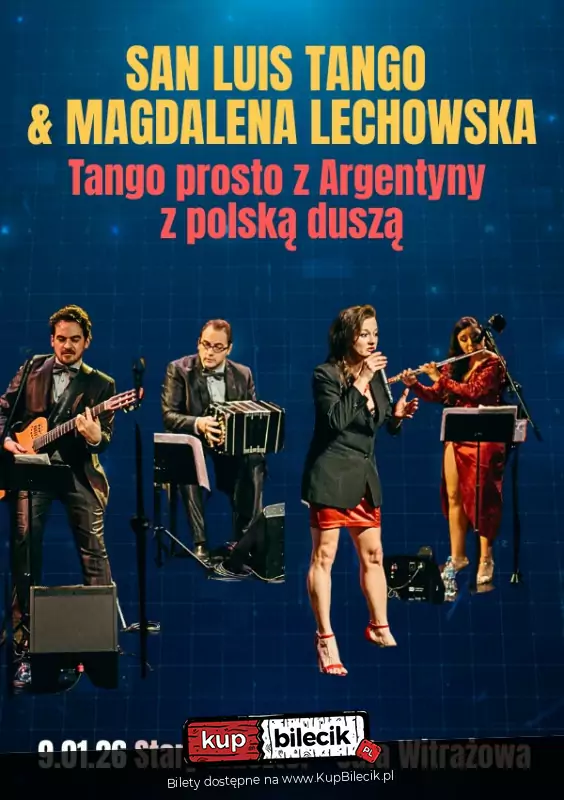 Zespół San Luis Tango, nominowany w 2016 roku do USA Fox Music Awards w kategorii "Najlepsza inspiracja / fuzja folkowa", wraz z charyzmatyczną polską wokalistką Magdaleną Lechowską, przeniesie publiczność w świat najpiękniejszych tang - zarówno argentyńskich, jak i polskich - w niezwykle kunsztownych aranżacjach. Założony w 2006 roku, San Luis Tango to formacja o międzynarodowej renomie, skupiająca wybitnych instrumentalistów i śpiewaków tanga, laureatów licznych prestiżowych nagród. Ich repertuar obejmuje klasyczne tanga, milongi i walce, inspirowane twórczością takich mistrzów jak Aníbal Troilo, Francisco Canaro, Astor Piazzolla czy Osvaldo Pugliese. Współpraca z Magdaleną Lechowską, polską artystką wychowaną w Ameryce Południowej, zaowocowała wyjątkowym projektem - połączeniem gorącego temperamentu Buenos Aires z nostalgicznym urokiem polskiego tanga. W ich interpretacjach tradycja spotyka nowoczesność, a emocje splatają się z wirtuozerią, tworząc muzyczną opowieść, która porusza serca i dusze.