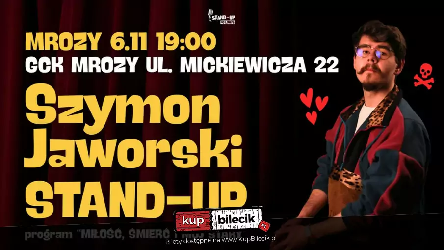 Szymon Jaworski, doświadczony standuper, zwycięzca legendarnego show "Masz Minutę", a także ogromnej ilości konkursów standupowych, w przeszłości support czołowych komików, wyrusza w trasę z nowym programem "Miłość, śmierć i mój stary"! Masa soczystych żartów na tematy wszelakie gwarantowana! Wpadnij na jedyny wieczór komedii w Mrozach!
