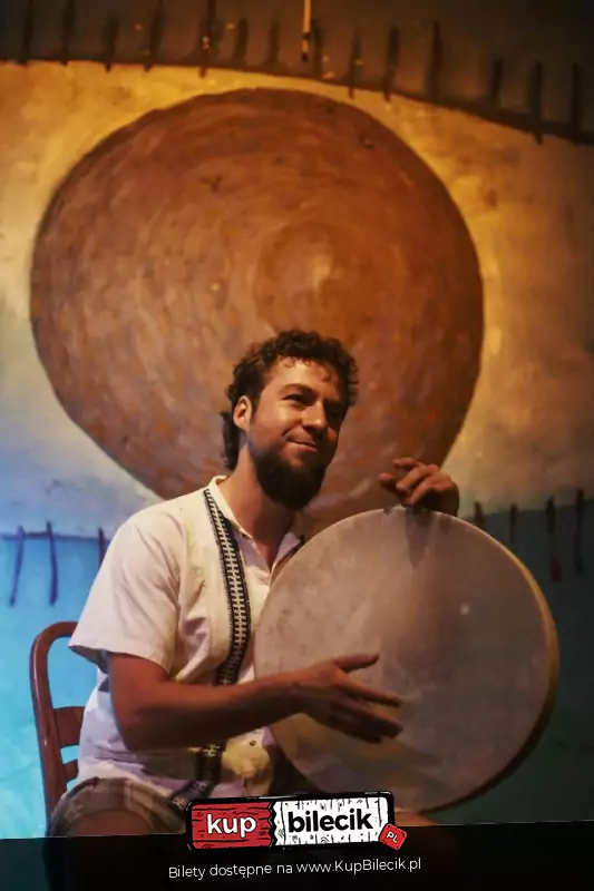 Opowiada i gra na instrumentach (kankles, bęben obręczowy, tank drum): Szymon Góralczyk - ArmAtowski z grupy Karawana Opowieści