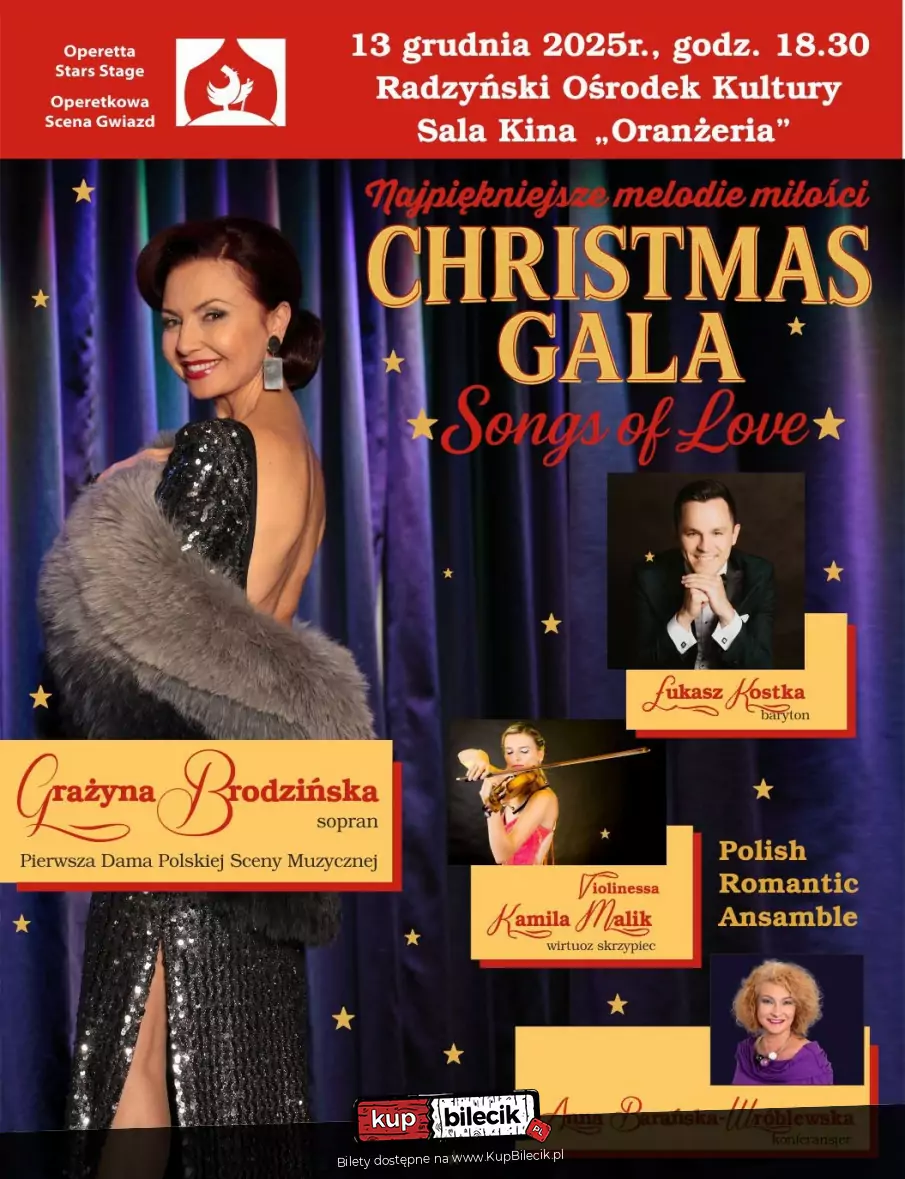 CHRISTMAS GALA - SONGS OF LOVE. Najpiękniejsze melodie miłości na Święta w ramach cyklu Operetkowa Scena Gwiazd. Po wielu latach nieobecności do Radzynia Podlaskiego powraca królowa polskiej operetki - Grażyna Brodzińska, nazywana Pierwszą Damą Polskiej Sceny Muzycznej.