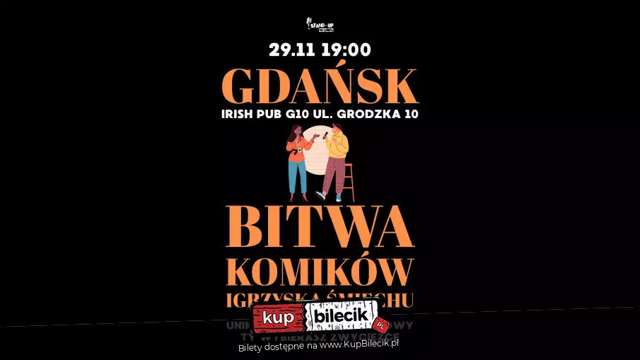 Legendarne show komediowe Bitwa Komików po raz pierwszy w Gdańsku! Już 29.11 o 19:00 w Pubie G10! Bitwa Komików to format fascynujący, który przypadł do gustu publiczności jeszcze parę lat temu, dzięki czemu wielokrotnie wypełnialiśmy sceny komediowe aż po brzegi! Bitwy Komików odbywały się w takich miejscowościach jak Siedlce, Kraków, Legionowo, Lublin, Poznań oraz Białystok!