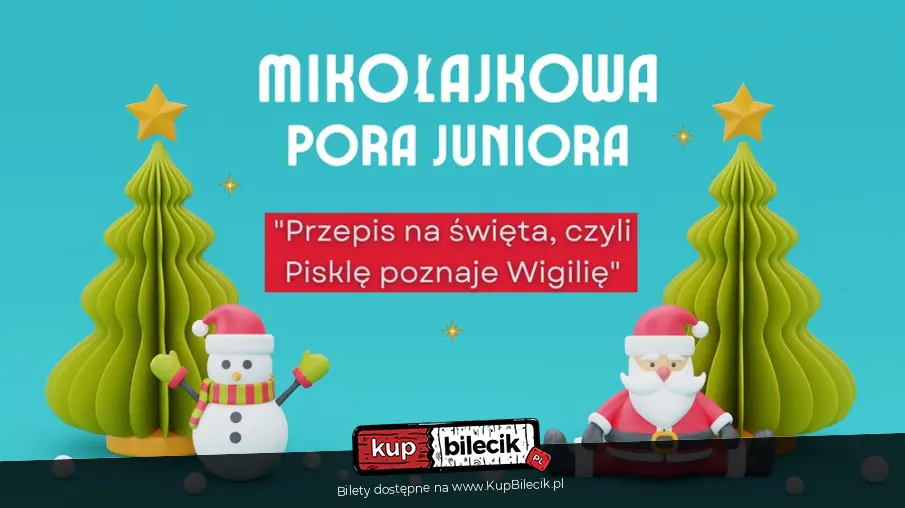 Zapraszamy na mikołajkowy spektakl z cyklu "Pora Juniora"! "Pora Juniora" to cykl spektakli dla najmłodszych widzów od 3 roku życia! Co miesiąc zapraszamy na inne kolorowe, interaktywne przedstawienie, które angażuje młodą publiczność zgromadzoną w Fabryce Kultury. Tym razem zapraszamy Was na spektakl pt. "Przepis na święta, czyli Pisklę poznaje Wigilię" ", Teatru Magmowcy z Torunia. Dzieci zostają pod opieką osoby dorosłej.