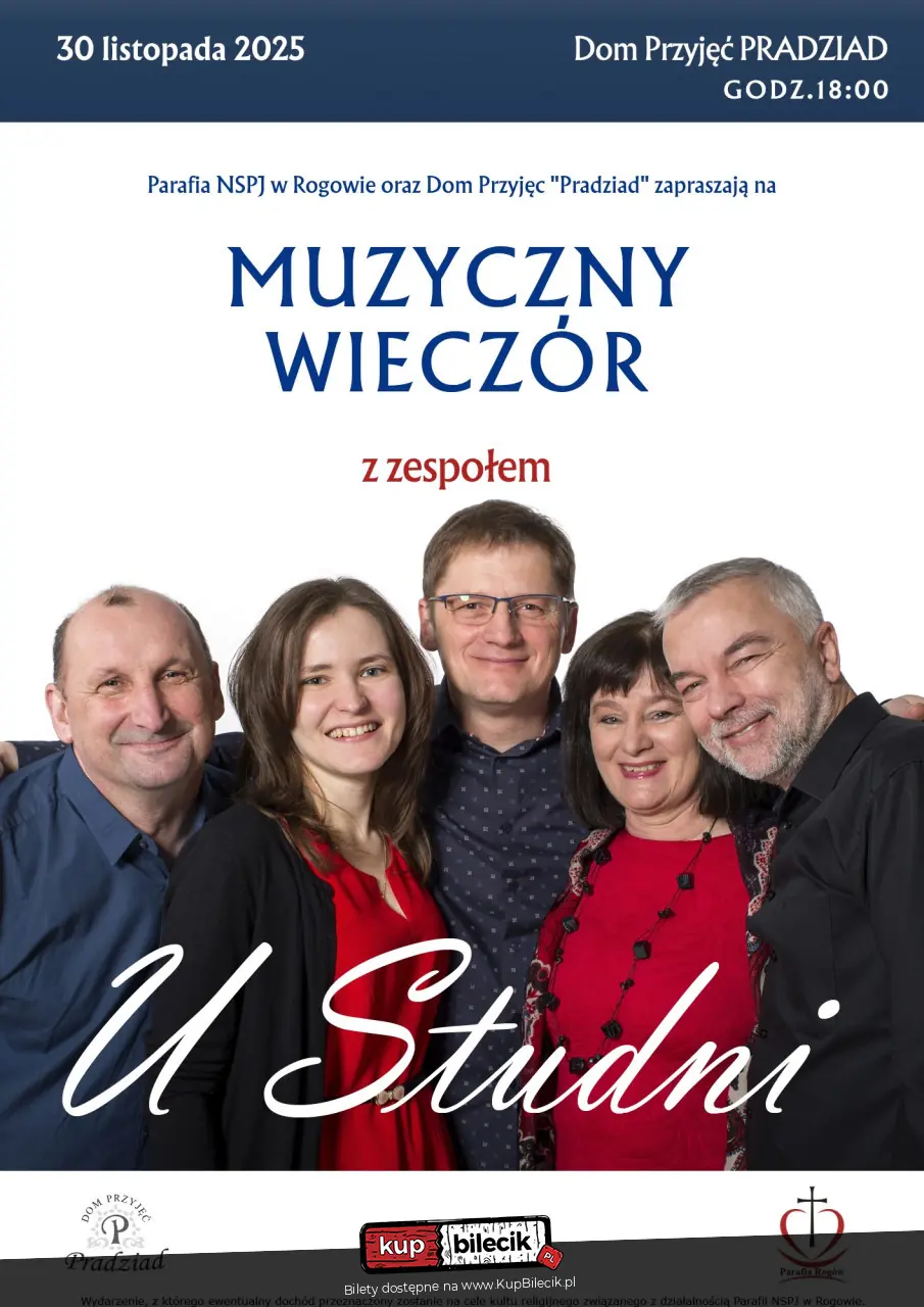 Zapraszamy na wyjątkowy i unikatowy koncert zespołu "U STUDNI". Zespół reprezentuje nurt tzw. Krainy Łagodności. Istnieje od 2012 roku, ale jego muzyczna historia trwa znacznie dłużej. Przez wiele lat członkowie zespołu współtworzyli rozpoznawalne brzmienie Starego Dobrego Małżeństwa. Mają na swoim koncie kilka płyt, a każdy koncert jest wyjątkowy.