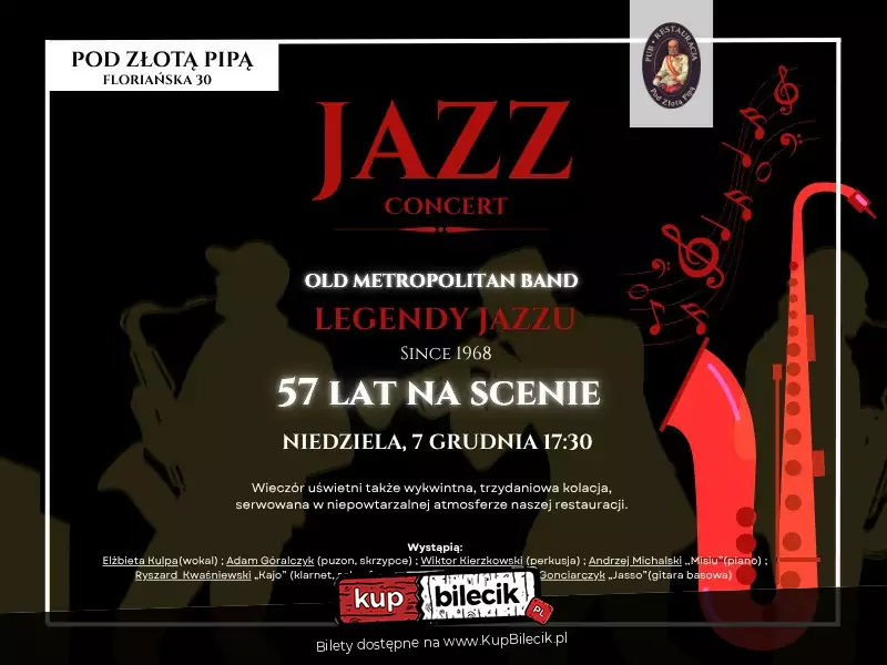 Z okazji 57-lecia działalności zespołu zapraszamy na niezapomniany wieczór pełen klasy, doskonałej muzyki i wykwintnych smaków! Old Metropolitan Band, najstarszy krakowski zespół jazzowy, zabierze Cię w fascynującą podróż przez świat klasycznego jazzu. Przygotuj się na rytmiczne brzmienia, pełne pasji improwizacje oraz niezwykły wokal, które na długo zapadną w pamięć.