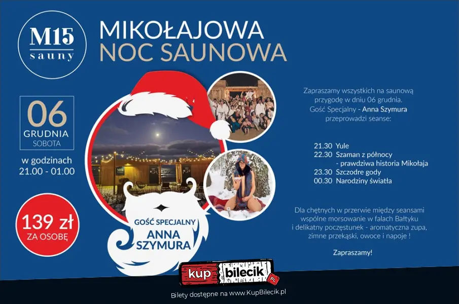 Mikołajkowa Noc Saunowa! Zapraszamy na świąteczną noc saunową 6 grudnia w godzinach 21:00 - 1:00, w saunach M15 w Sopocie - gościem specjalnym będzie wyjątkowa saunamistrzyni Anna Szymura, która poprowadzi dla Was 4 seanse: