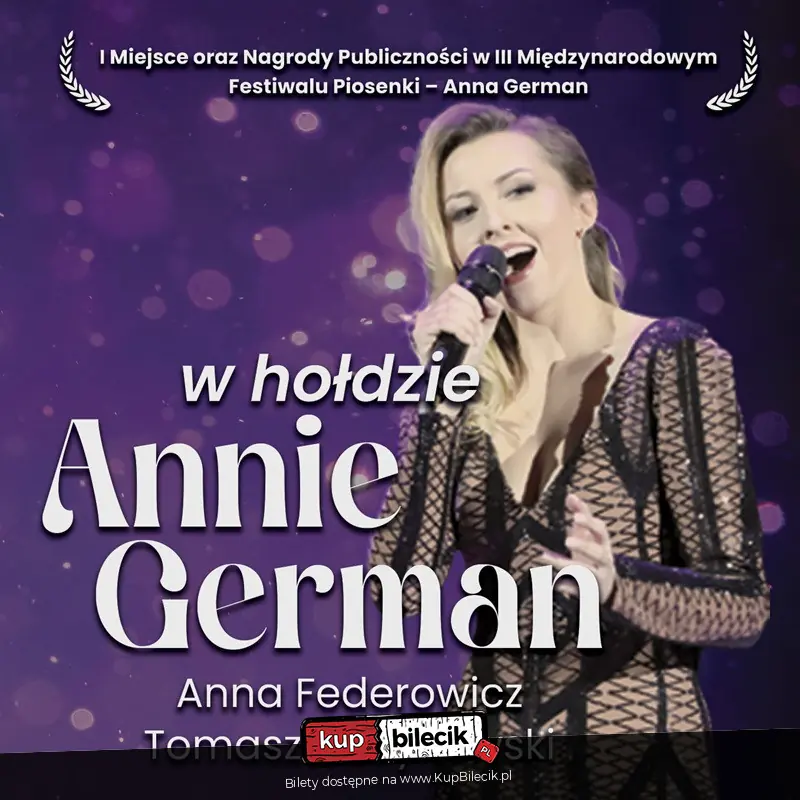 Zapraszamy na wyjątkowy wieczór - DZIEŃ BABCI, z piosenkami jednej z najwybitniejszych artystek polskiej piosenki - Anny German. W koncercie wystąpią Anna Federowicz i Tomasz Stroynowski - laureaci pierwszego miejsca oraz nagrody publiczności w III Międzynarodowym Festiwalu Piosenki - Anna German. Gwarantujemy, że wspomnienie wielkich emocji, przepięknej muzyki i mądrych tekstów pozostaną z Państwem na długo.