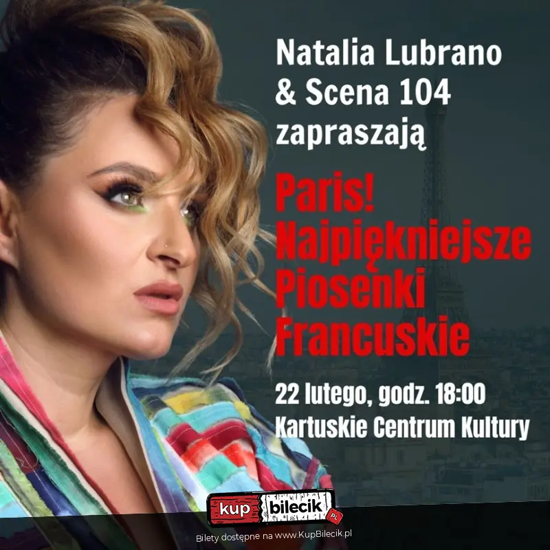 Muzyczne wędrówki paryskimi uliczkami nie mogłyby się odbyć bez ponadczasowych, poetyckich kompozycji, na których wychowało się już kilka pokoleń entuzjastów francuskiej muzyki. Wśród znanych szerokiej publiczności utworów, usłyszymy najpiękniejsze piosenki takich artystów jak: Edith Piaf, Charles Aznavour, Enzo Enzo, Joe Dassin, ZAZ czy Claude François. Program Natalii Lubrano z akompaniamentem Sceny 104 stanowi ukłon w stronę największych nazwisk tworzących obraz francuskiej muzyki. Tego wieczoru z pewnością nie zabraknie czułych emocji i wzruszeń, a powrót do kultowych utworów znad Sekwany, zachęci nas do chwili uśmiechu czy wspaniałych wspomnień.