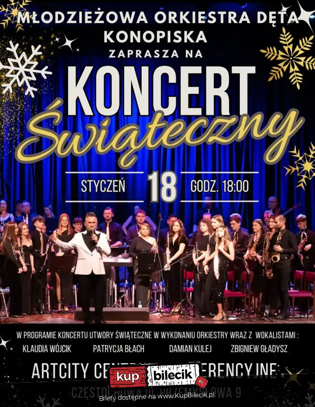Koncert Świąteczny Młodzieżowej Orkiestry Dętej Konopiska. W programie koncertu znajdą się najpiękniejsze utwory świąteczne w wykonaniu orkiestry wraz z wokalistami : Klaudia Wójcik , Patrycja Błach , Zbigniew Gładysz, Damian Kulej. Orkiestra pod dyrekcją Jacka Walentka. Chcemy wspólnie z Państwem spędzić ten wspaniały ,świąteczny czas , pełen muzyki, radości i wyjątkowych emocji.