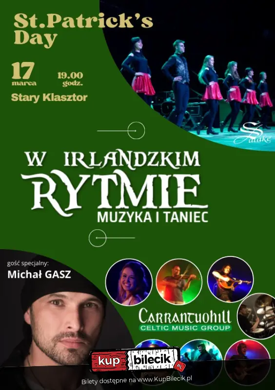 Ethno Jazz Festival zaprasza na wrocławskie obchody Dnia Św. Patryka. 17 marca w Sali Gotyckiej w Starym Klasztorze zespoły CARRANTUOHILL oraz SALAKE zaprezentują muzyczno-taneczne widowisko "W Irlandzkim Rytmie" Występujący od ponad 30 lat na scenie, nagrodzony Fryderykiem za swoją muzykę, zdobywca Złotej I Platynowej Płyty - zespół CARRANTUOHILL, wspólnie z wielokrotnymi mistrzami świata w tańcu irlandzkim - formacją SALAKE prezentują nowatorskie widowisko artystyczne w irlandzkim rytmie. Wyjątkowy koncert... bogate stroje... wspaniała muzyka... mistrzowski taniec... Tym razem - podczas największego irlandzkiego święta - z zespołem Carrantuohill wystąpi gościnnie Michał Gasz.