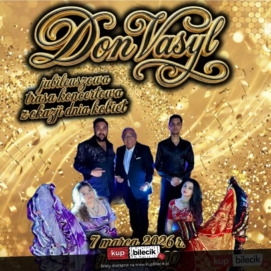 Z okazji Dnia Kobiet Don Vasyl ze swoim rozstańczonym, kolorowym i rozśpiewanym taborem zawita do swojego rodzinnego miasta! Koncert "Od Czardasza do Przeboju". Zapraszamy Państwa serdecznie na wyjątkowy jubileuszowy, sentymentalny koncert w wykonaniu Don Vasyla z Rodzinnym Zespołem oraz pięknymi tancerkami w cekinowo-koronkowych sukniach cygańskich. Usłyszymy największe przeboje piosenkarza takie jak: "Jedno jest niebo dla wszystkich", "Tańcz ze mną moje życie", "Ja już wygrałem" i wiele inne.