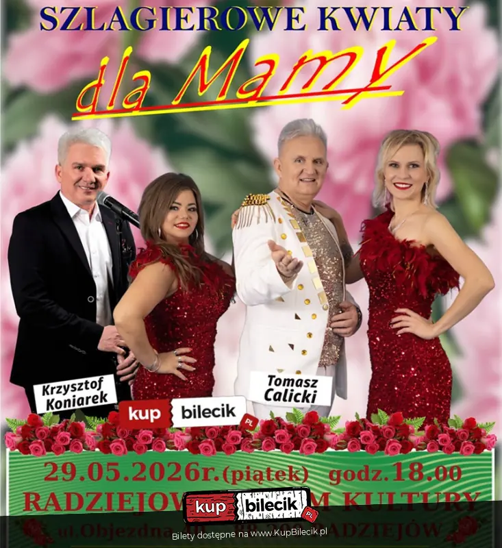 Któż z nas nie kocha swojej Mamy? Z okazji ich święta serdecznie zapraszamy na koncert "Szlagierowe Kwiaty dla Mamy". Czeka nas wieczór pełen emocji, wspaniałej, melodyjnej muzyki, pozytywnej energii i wzruszeń. Nie zabraknie także dobrego humoru, a o to wszystko zadbają Krzysztof Koniarek z zespołem oraz Tomasz Calicki z zespołem, artyści znani m.in. z anteny telewizji TVS oraz wielu rozgłośni radiowych. Spotkajmy się na koncercie i wspólnie świętujmy ten szczególny dzień, jakim jest Dzień Matki!