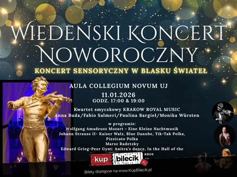 Zapraszamy na magiczny koncert, który przeniesie Cię do serca wiedeńskiej elegancji, a odbędzie się w urokliwej Auli neogotyckiego Collegium Novum Uniwersytetu Jagiellońskiego. Gwarantujemy niezapomniane przeżycie w atmosferze pełnej blasku i wspaniałej muzyki. Wiedeński Koncert Noworoczny to prawdziwa uczta dla zmysłów w blasku migoczących świec i iluminacji świetlnych, które ożywią ten wyjątkowy wieczór. Magia walca, polki i czardasza oczaruje każdego melomana.