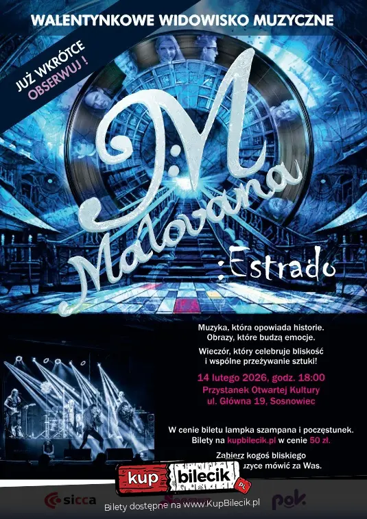 Ten koncert zespołu Malovana odbędzie się w wyjątkowej, walentynkowej oprawie! To propozycja dla par, które chcą spędzić ten wieczór inaczej niż zwykle - w atmosferze bliskości, wspólnych emocji i sztuki przeżywanej razem. Na uczestników czeka lampka szampana oraz poczęstunek, które dopełnią ten nastrojowy wieczór i sprawią, że wydarzenie stanie się nie tylko koncertem, ale pełnym doświadczeniem celebrującym relację i wspólnie spędzany czas.