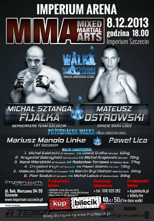 IMPERIUM ARENA zaprasza na pierwszą odsłonę Mixed Martial Arts (Mieszane Sztuki Walki), która odbędzie się 08. 12. 2013 o godz. 18.00. Wkrótce przedstawimy Państwu wszystkich zawodników w tym nazwiska gwiazd wieczoru.