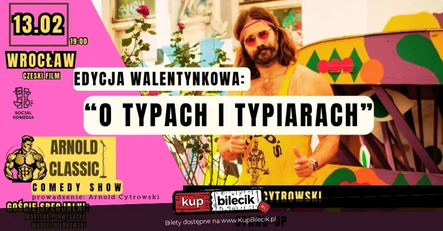 Show otrzymuje roboczą, wiele mówiącą nazwę "O TYPACH I TYPIARACH", gdzie razem z moimi gośćmi - znanymi nie tylko lokalnie, ale i w sieci Marcelem Bieńkowskim i Martyną Podwysocką - omawiać będziemy meandry skomplikowanych relacji międzyludzkich, rzecz jasna tych romantycznych. W końcu to niemal walentynki. Jesteś sam, sama? Wbijaj. O, jednak masz kogoś? Wbijajcie razem. Nie chcesz wbijać? Mega gej z Ciebie, ale ok. Zatańczmy wszyscy jak na sali wielkiej i błyszczącej tak jak nocne Buenos Aires.